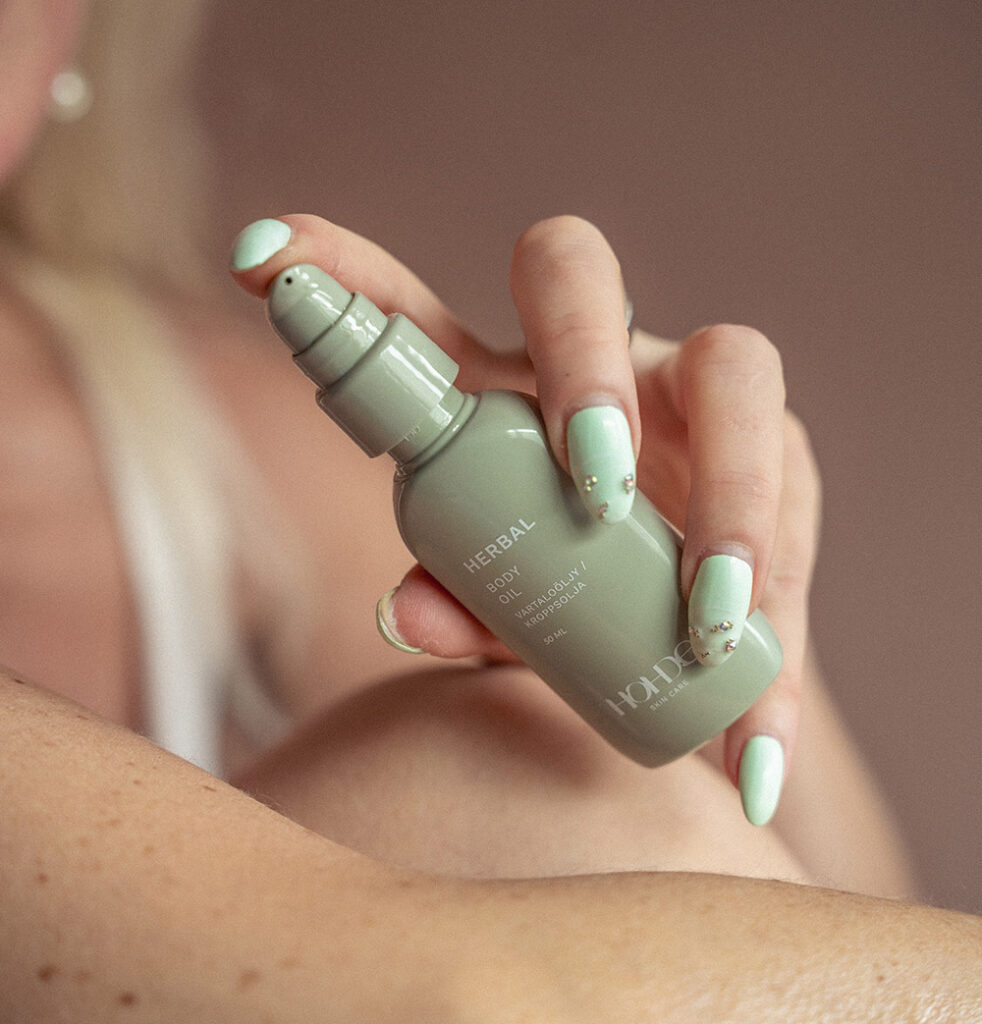 HOHDE Herbal Kroppsolja är en lyxig precisionsprodukt designad för att återfukta kroppen. Om du vill kan du använda både body lotion och kroppsolja. Till exempel kan du lägga till en droppe HOHDE Herbal Kroppsolja till din body lotion när du behöver mer näring.